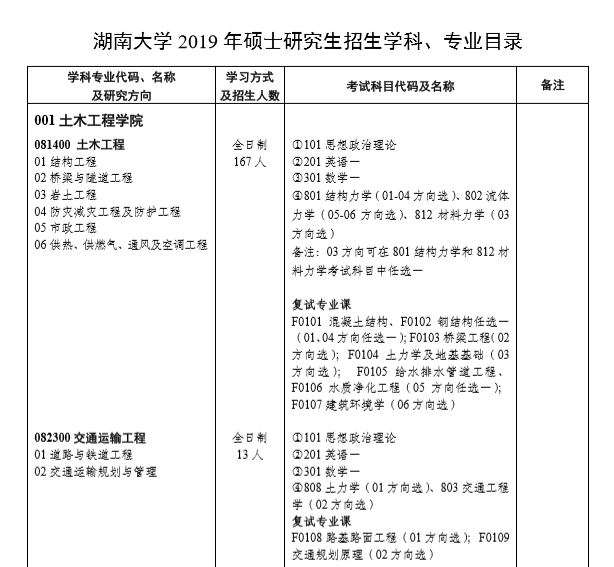 完整版内容请查看附件:湖南大学2019年硕士研究生招生学科、专业目录