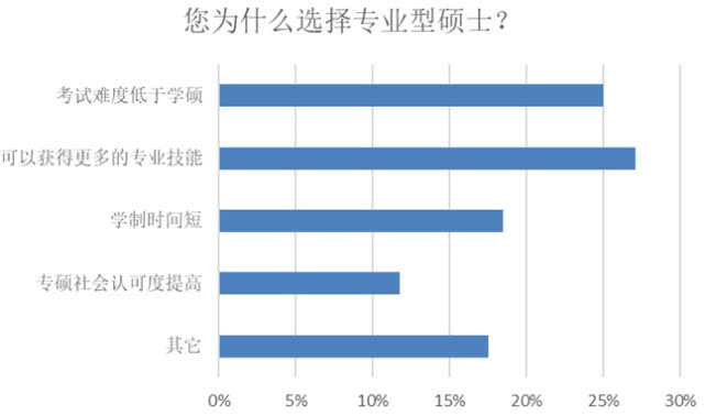 考生选择专业硕士首要原因是可以获得更多专业技能,其次是由于难度低于学术硕士而选择专业硕士,第三是因为学制时间短。
