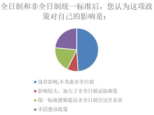 从调查来看,对于非全日制纳入统考,统一标准,近半数考生认为对自己没有影响,不考虑非全日制。仍有近四分之一的考生不清楚该政策。
