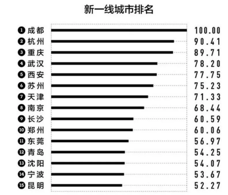 结果显示,一线城市的座次从去年的“上北深广”重归“北上广深”。同时也评选出了最具魅力的15座新一线城市:依次为成都、杭州、重庆、武汉、西安、苏州、天津、南京、长沙、郑州、东莞、青岛、沈阳、宁波、昆明。