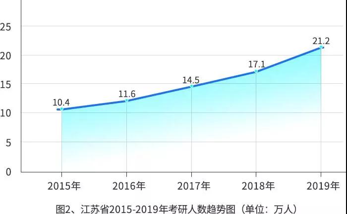 江苏省一直是考研大省,从2015年的10.4万人到2019年的21.2万人,5年间,考研人数翻了一番还多。