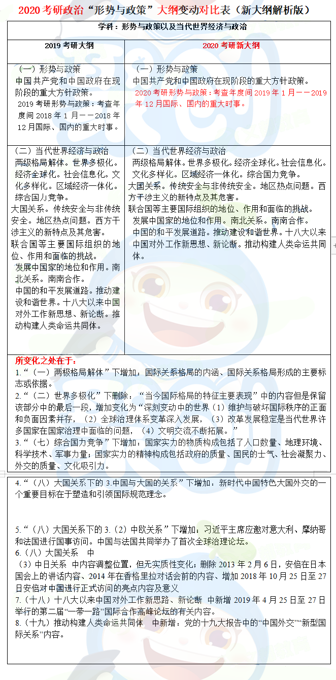 今年考研政治大纲提前到7月中旬发布,其中改动较大的科目必然是考研政治!聚创考研信息网将2020年考研大纲和2019考研政治大纲进行对比,找出新增、删减考点,希望能帮助到2020考研的同学们。