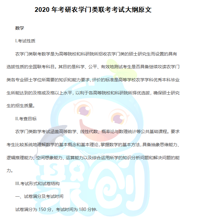 以上是聚创考研网为考生整理的"2020年考研农学门类联考考试大纲原文内容"的相关考研信息,希望对大家考研备考有所帮助! 备考过程中如有疑问,也可以添加老师微信juchuang911进行咨询。