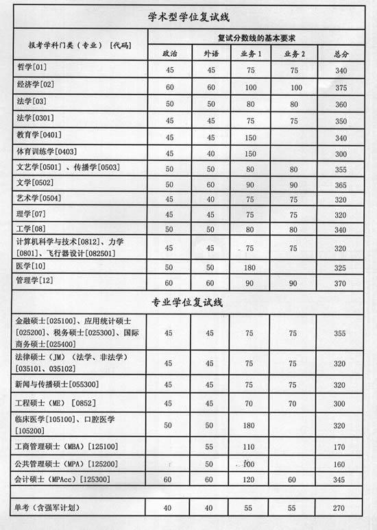一、此分数线为学校划定的各学科或专业(领域)单科、总分的最低分数线,单科、总分须同时满足要求。考生能否进入复试,还须达到各学院按差额复试比例规定的各项单科和总成绩要求,请考生们咨询或查看报考学院网页公布的实际复试分数线。