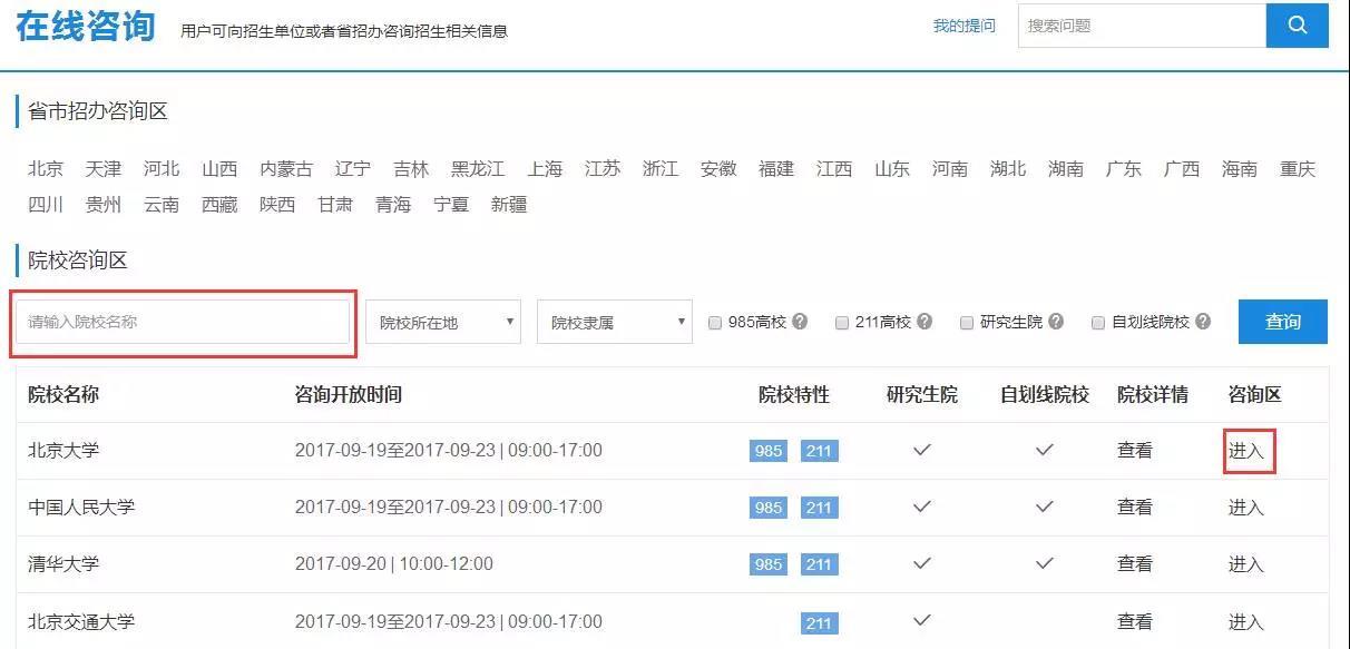 进入【在线咨询】,你会进入以下页面。在“院校咨询区”下方搜索框中输入你要了解的院校名称。