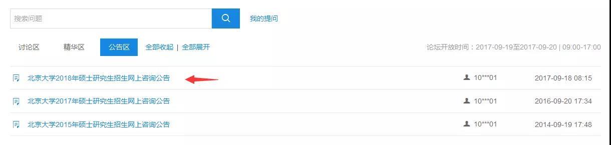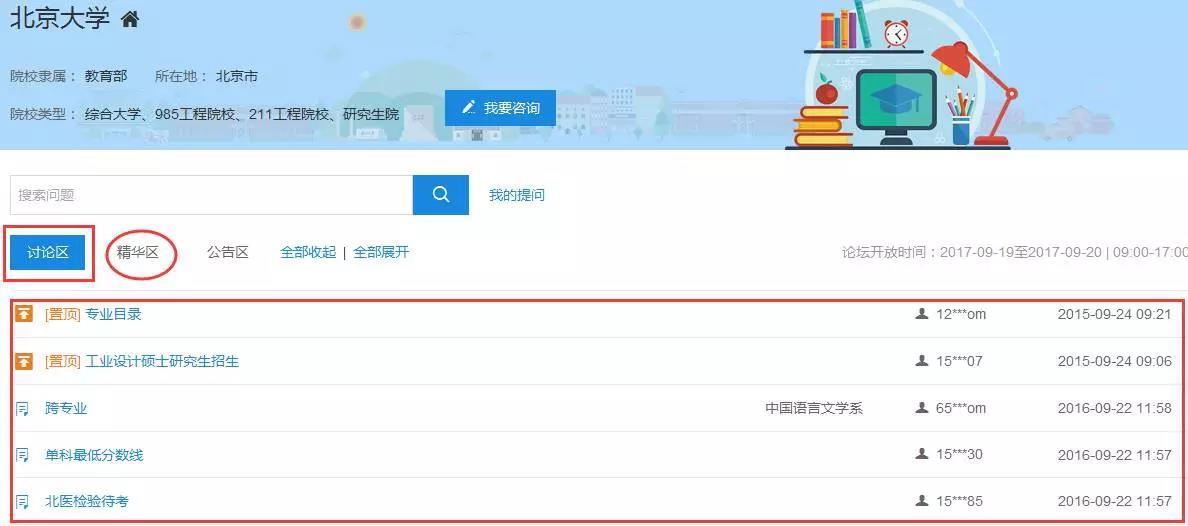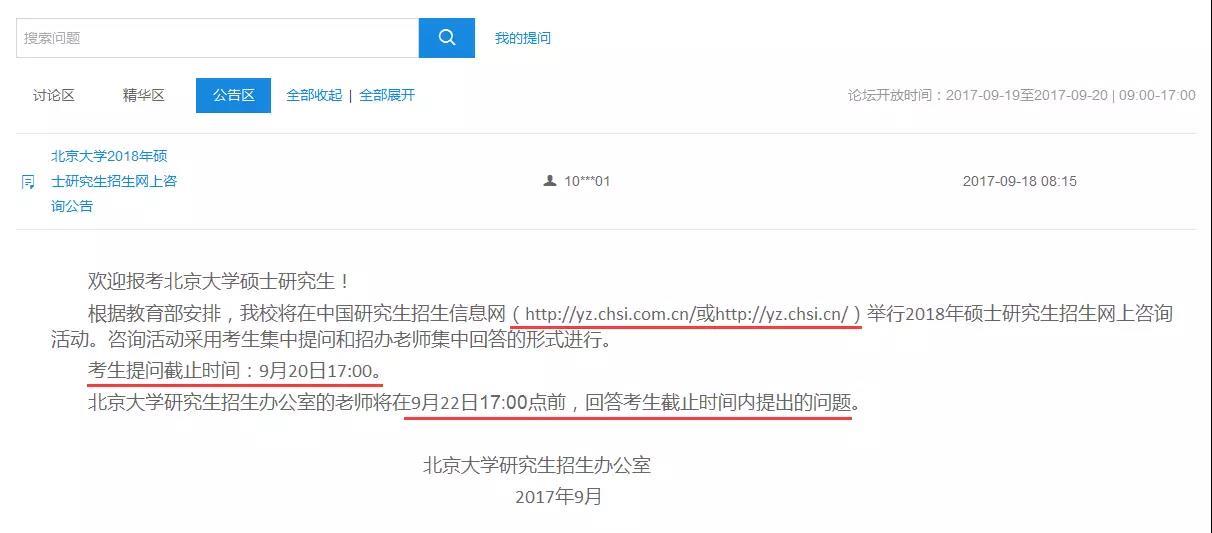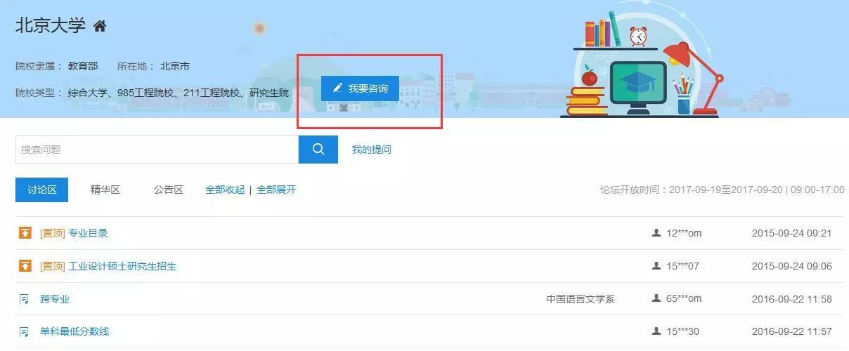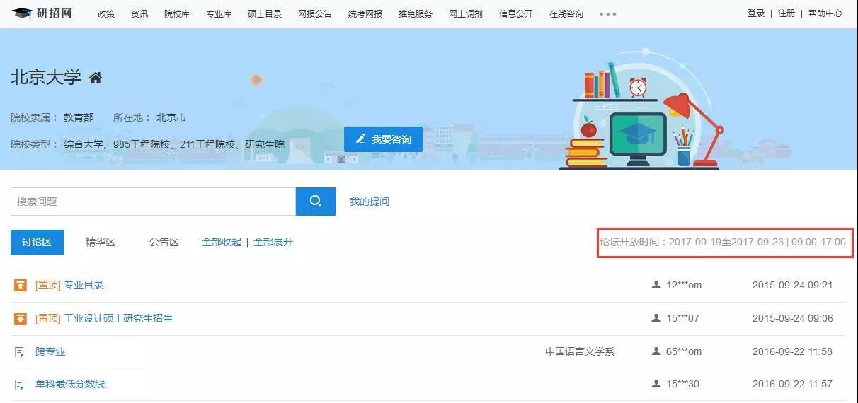 小伙伴们一定要注意自己的目标院校的论坛开放时间,比如北京大学的论坛开放时间小编已经框框出来了,为2017-09-19至2017-09-23|09:00-17:00,大家可以在这个时间段内在该页面进行提问。每个院校的论坛开放时间不同,但是小编看了一下,都在今年的2017-09-19至2017-09-23之间的某些时间,具体的院校小伙伴们自己要留意哦,不要错过这个机会哟~