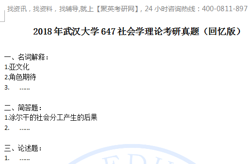 聚英武大考研网整理了2018年武汉大学647社会学理论考研真题(回忆版),部分内容如下: