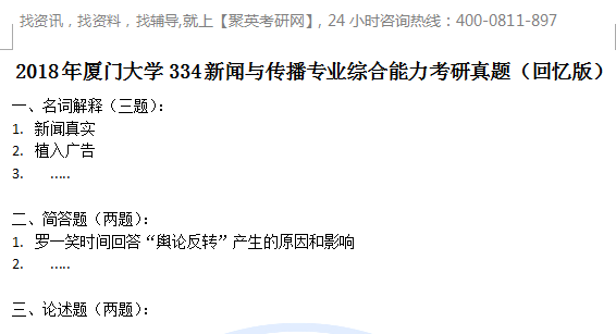 以上是聚英厦大考研网为考生整理的"2018年厦门大学334新闻与传播专业综合能力考研真题(回忆版)"的相关考研信息,希望对大家考研备考有所帮助! 备考过程中如有疑问,也可以添加老师微信H17720740258进行咨询。