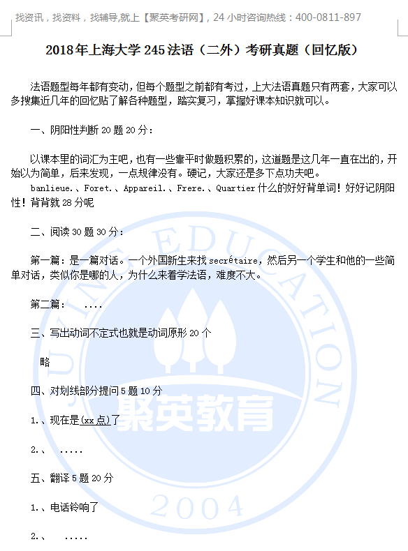 以上是聚创考研网为考生整理的"2018年上海大学245法语(二外)考研真题(回忆版)"的相关考研信息,希望对大家考研备考有所帮助! 备考过程中如有疑问,也可以添加老师微信juchuang911进行咨询。