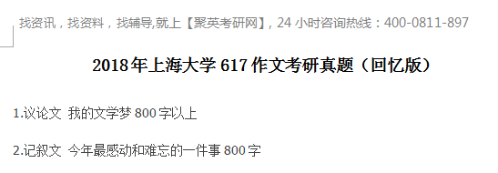 以上是聚创考研网为考生整理的"2018年上海大学617作文考研真题(回忆版)"的相关考研信息,希望对大家考研备考有所帮助! 备考过程中如有疑问,也可以添加老师微信juchuang911进行咨询。
