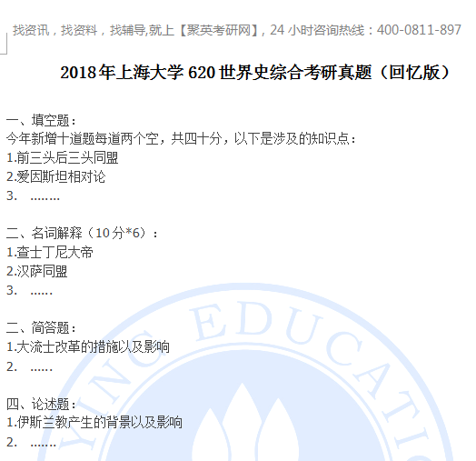 聚英上大考研网整理了2018年上海大学620世界史综合考研真题(回忆版),部分内容如下: