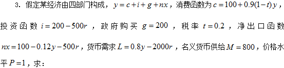 (3)产品市场和货币市场同时均衡时的均衡利率和均衡收入;