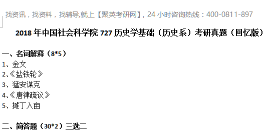 聚英考研信息网整理了2018年中国社会科学院727历史学基础(历史系)考研真题(回忆版),部分内容如下: