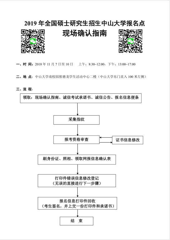 以上是聚创考研网为考生整理的"2019年全国硕士研究生招生中山大学报考点(报考点代码:4413)现场确认指南"的相关考研信息,希望对大家考研备考有所帮助! 备考过程中如有疑问,也可以添加老师微信juchuang911进行咨询。