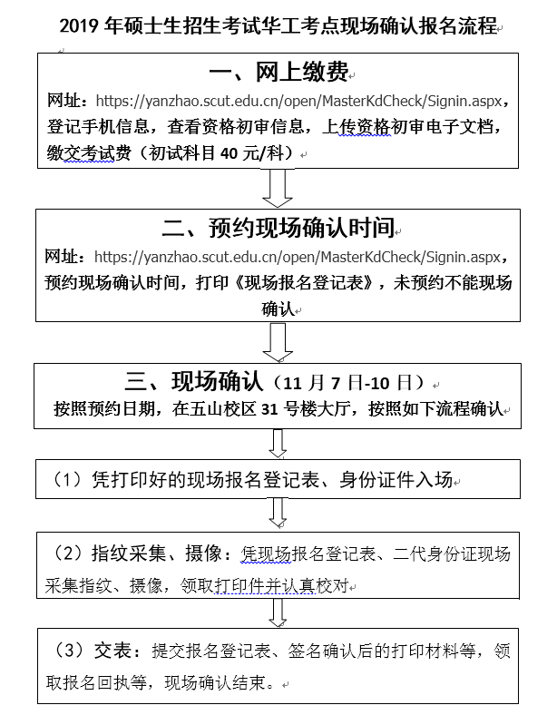 2.现场确认报名地点:华南理工大学五山校区31号楼1楼大厅(点击查看华南理工大学2019年硕士生招生考试现场确认地点)