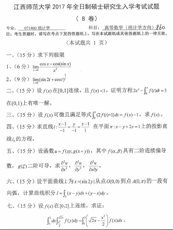 以上是聚创考研网为考生整理的"2017年江西师范大学860高等数学(统计学方向)硕士研究生考试真题"的相关考研信息,希望对大家考研备考有所帮助!