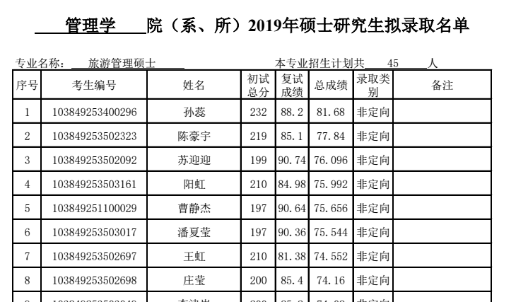 完整版名单查看附件:厦门大学管理学院2019年旅游管理硕士拟录取名单.pdf