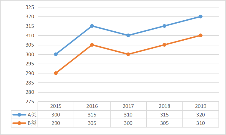 2015-2019年法学总分国家线趋势图及单科复试分数
