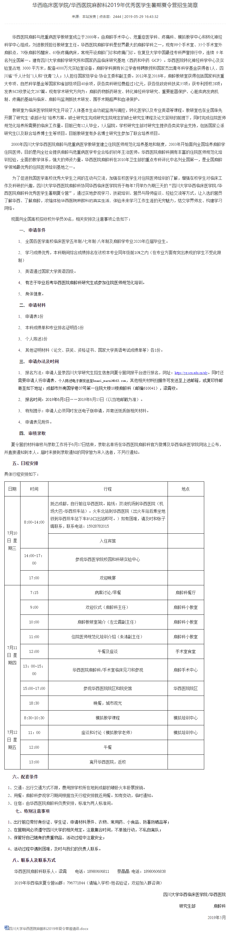 附件:四川大学华西医院麻醉科2019年夏令营邀请函.docx