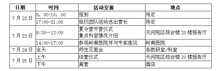 为促进国内有志于在医学领域奋斗的优秀大学生的学习和交流, 增进优秀青年学生对我院学科及研究生教育状况的了解,协助同学了解中山大学附属第三医院研究生推荐免试等相关事宜,中山大学附属第三医院将于2019年7月22日-7月25日举办“相约广州·走进中山三院” 2019年优秀大学生夏令营活动,并从中选拔优秀学生给予继续深造的机会。欢迎各位学子积极参加。
